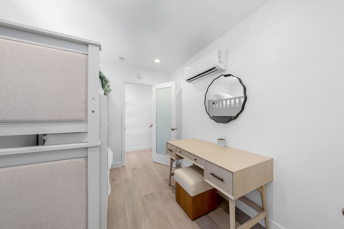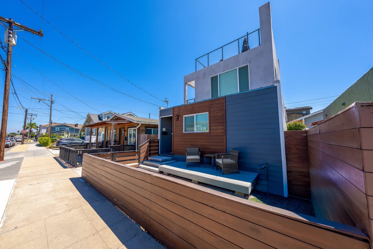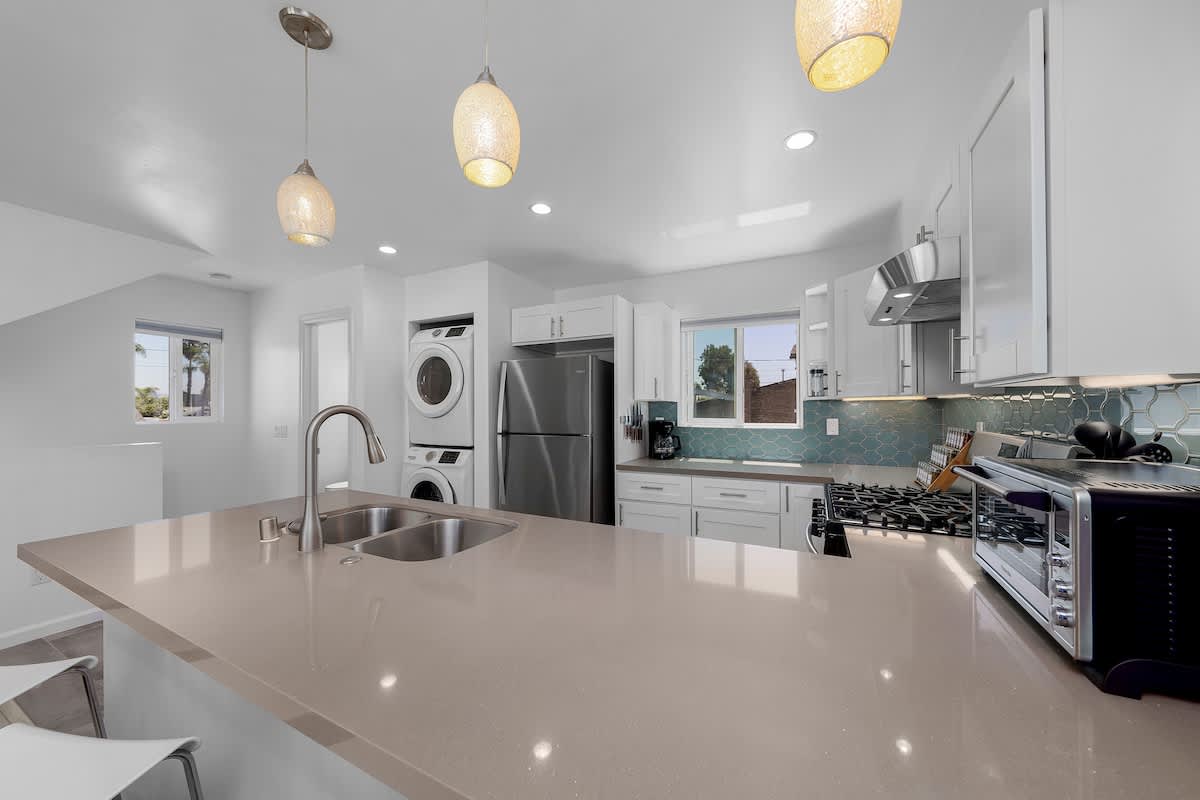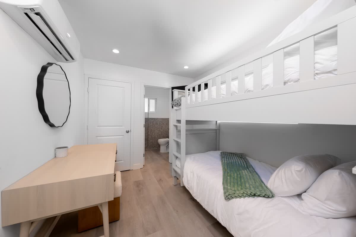 This two-story home offers style, space, and a true San Diego experience. Downstairs features a bunk-bed bedroom and a full size en-suite bathroom with a walk-in shower plus a mini-split for heating and cooling.