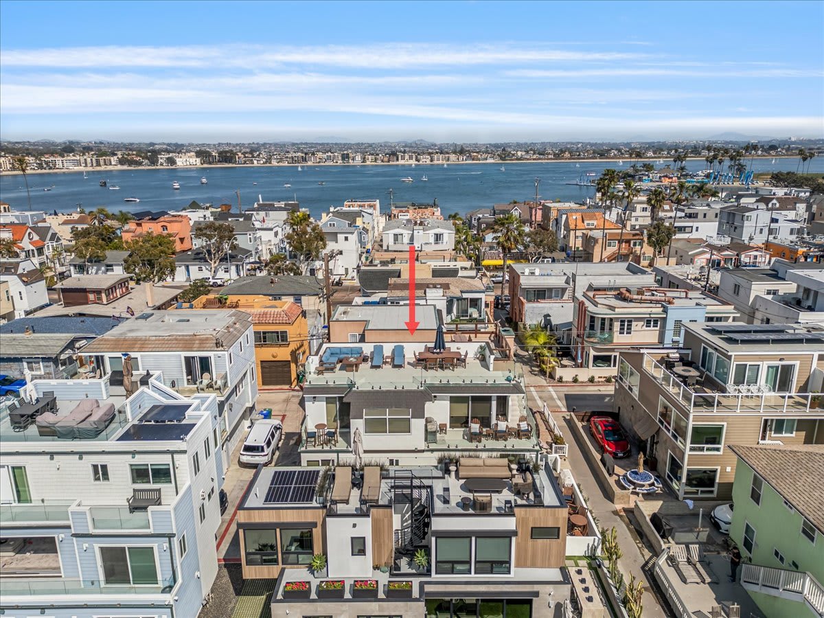 The crown jewel of this unique property, the amazing rooftop deck, boasts umbrella-shaded alfresco dining, a two-seat lounger, gas fire pit, and panoramic views of the Pacific Ocean and Mission Bay.