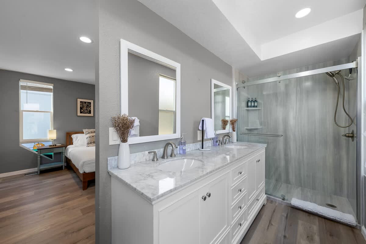 *1st floor bedroom features a queen size bed, and an en-suite bathroom, shower only no tub. Smart TV